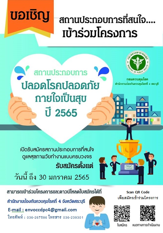 สำนักงานอุตสาหกรรมจังหวัดสระบุรี ขอประชาสัมพันธ์ โครงการ ”สถานประกอบการ ปลอดโรค ปลอดภัย กายใจเป็นสุข” และโครงการ ”ศูนย์สุขภาพดีวันทำงาน (Wellness Center) ปี2565 รายละเอียดและการสมัครผ่านทาง QR CODE